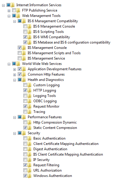 Note: this will pretty much install everything under IIS. I recommend that you either go through and remove some of the above settings, or go in afterwards and do so.