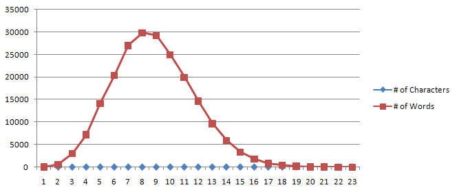 Nothing really complicated here. I loaded the files into a file array by using the Directory.GetFiles() method, replaced “rn” with “n” since the Environment.NewLine creates carriage return and a newline, split the array, and appended the length of the array (along with the number of characters in the word) into a file. Here were the results: